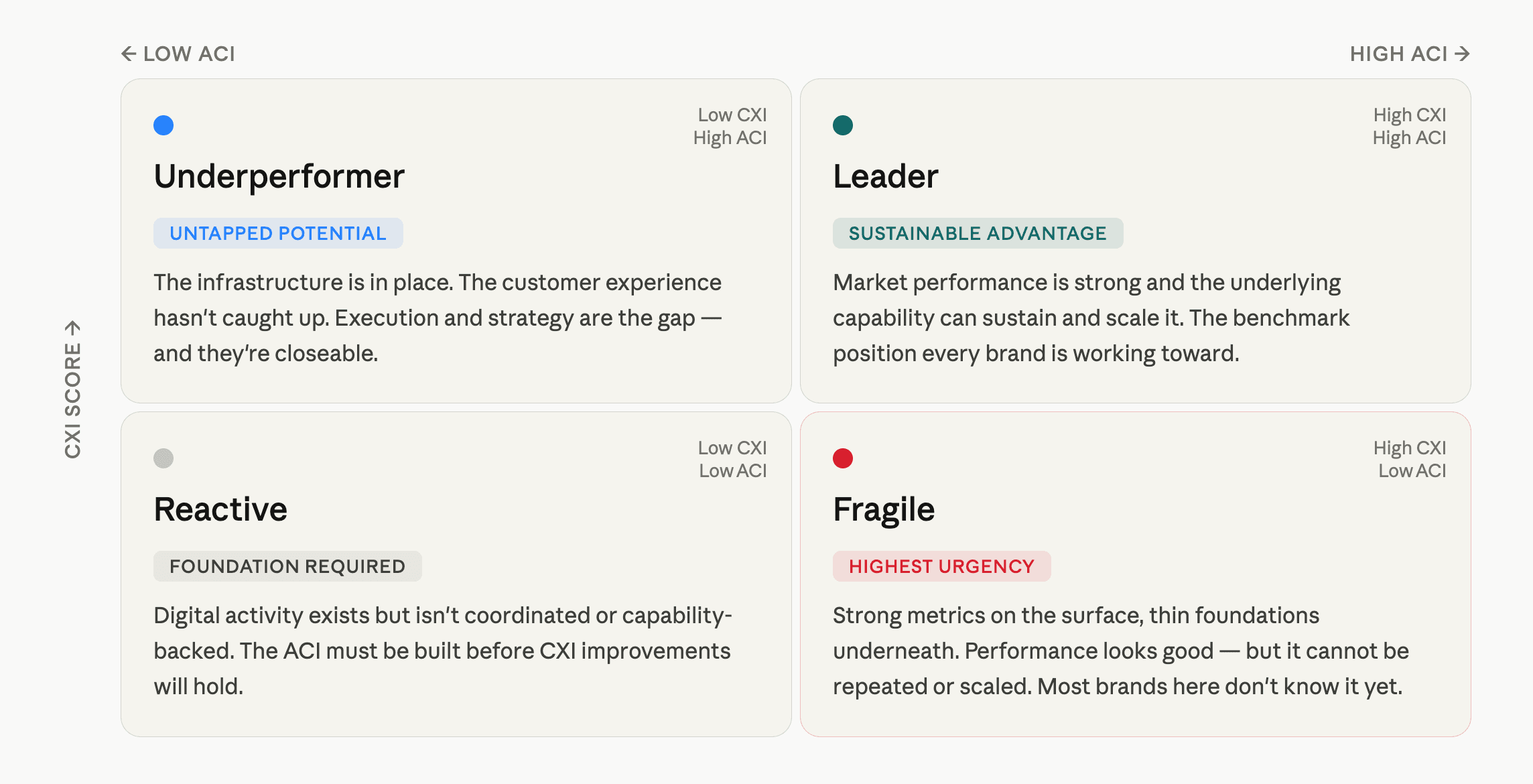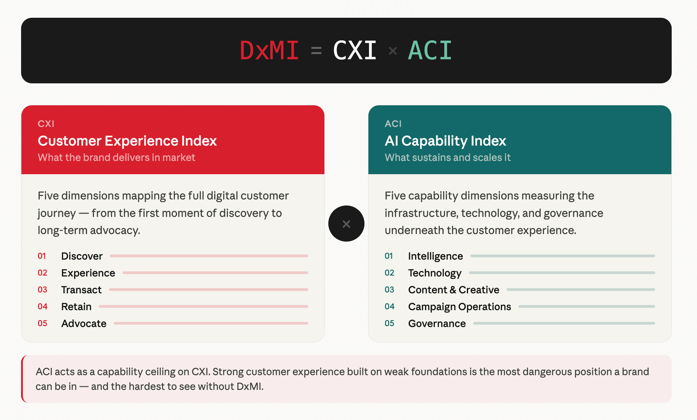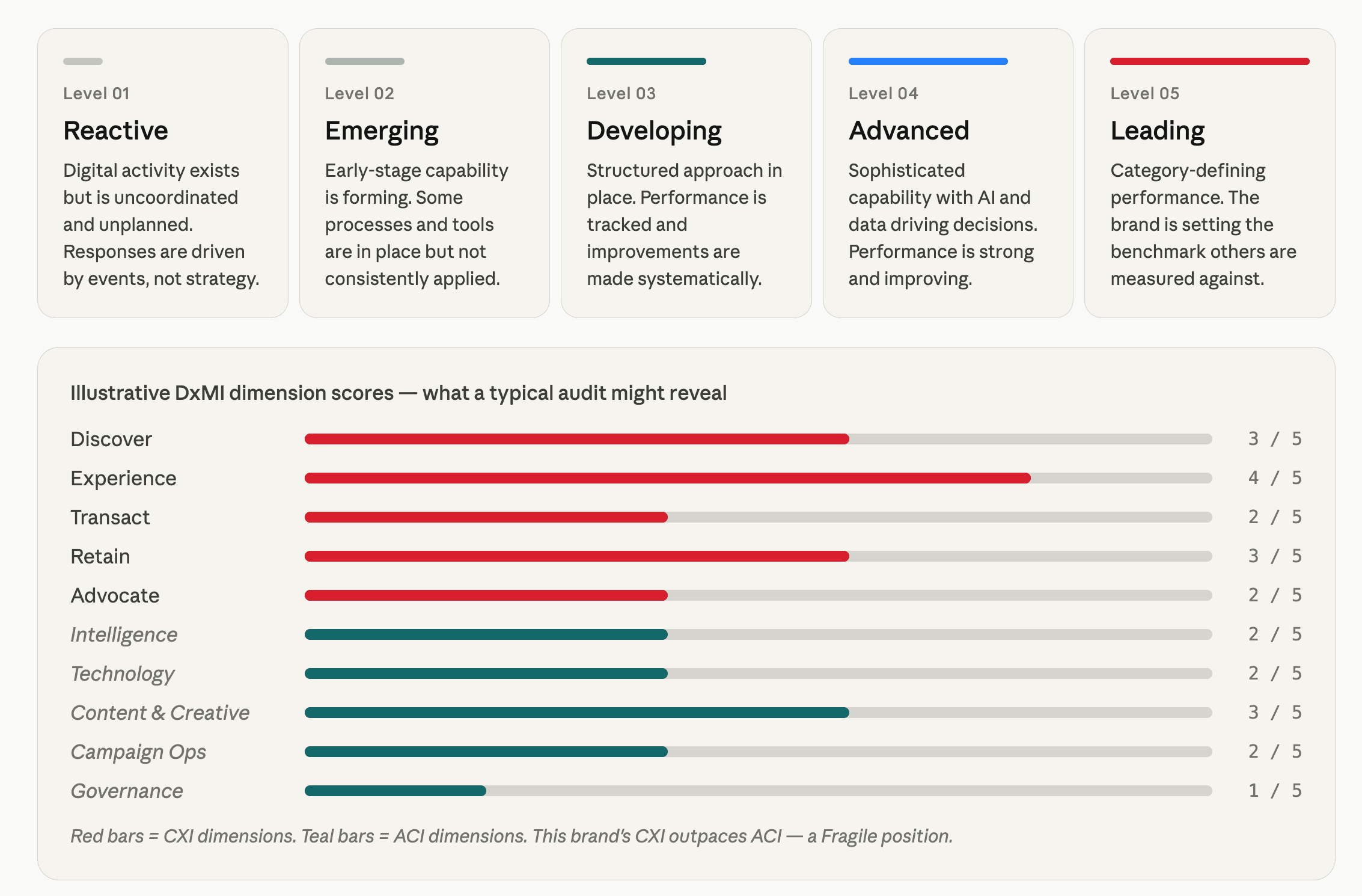 The Fragile position is the most important finding DxMI produces — and the one most brands never see coming. Their experience metrics are strong. Their teams feel confident. But the data infrastructure, the technology integrations, the content systems, and the governance that would need to exist to sustain that performance simply aren't there. DxMI makes that visible before it becomes a crisis.